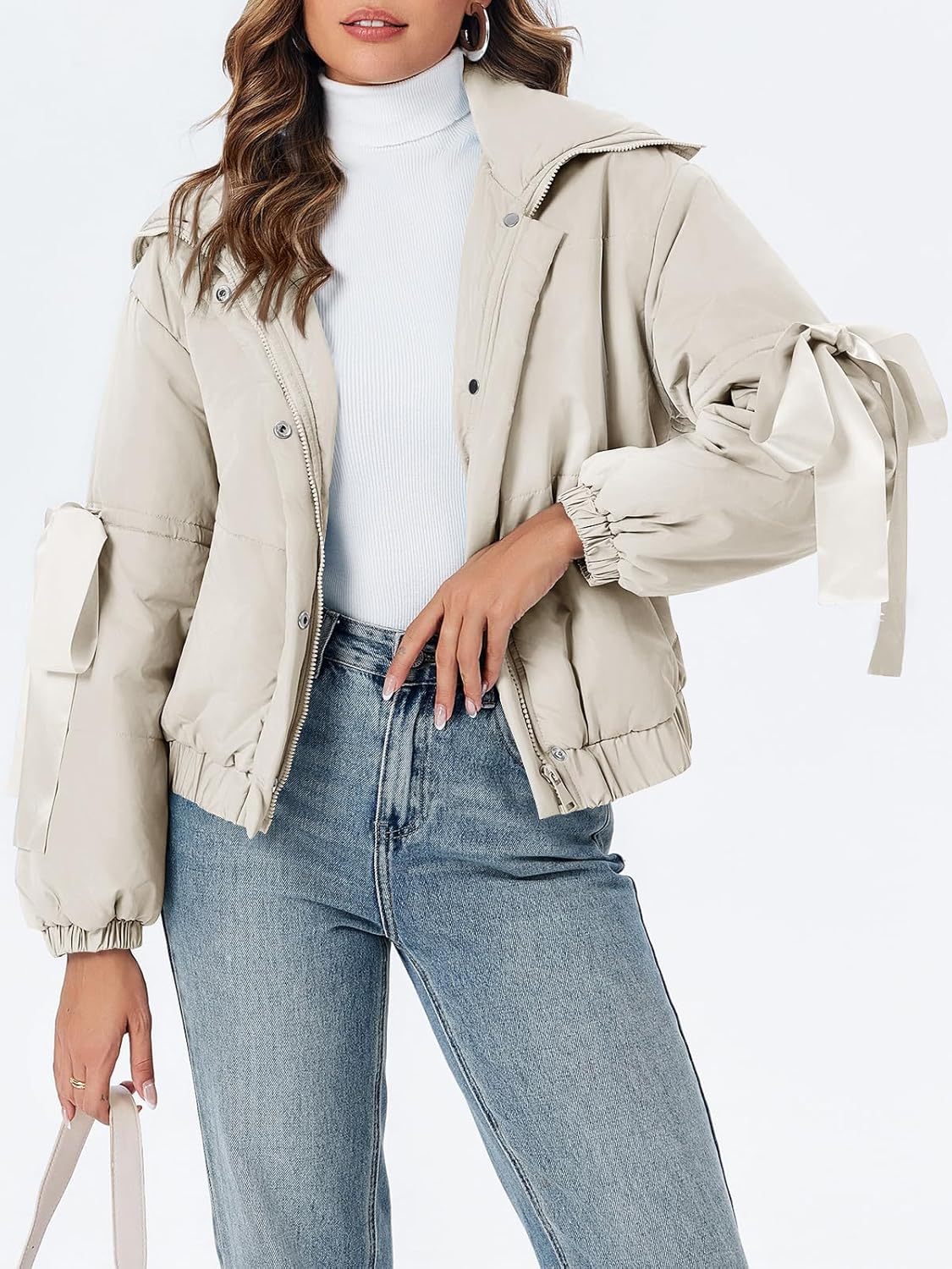 - Unique design: It features a collared neckline, zipper and button closure, side pockets, and bow knot strings on the elbows for a feminine touch. Its fashionable design ensures versatile wear for any occasion.