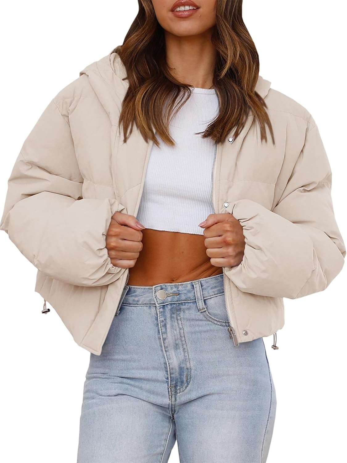 - Trendy&Practical Design: Stand out from the crowd with our women’s crop puffer jacket featuring a front zipper closure, two convenient slit pockets, a loose fit silhouette, a cozy hood, long lantern sleeves with drop shoulders, soft and warm padding, a solid color design, a lightweight oversized look, elasticated cuffs, and a drawstring feature on the hemline. Finished with silver press stud buttons for an added touch of elegance.